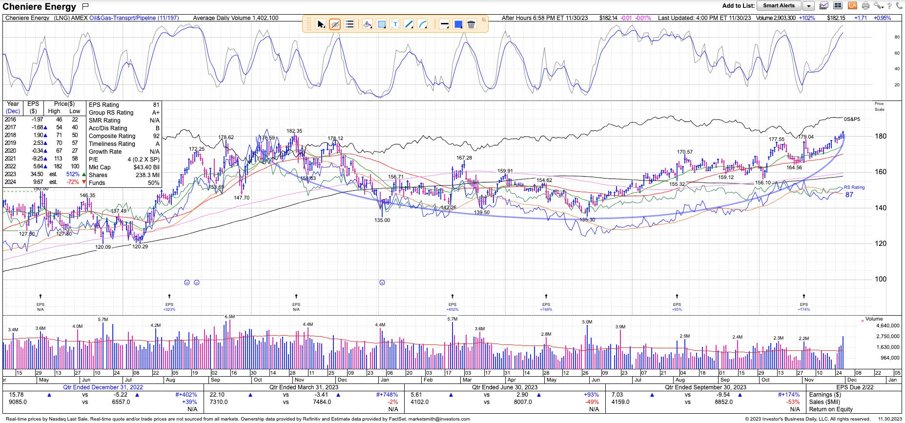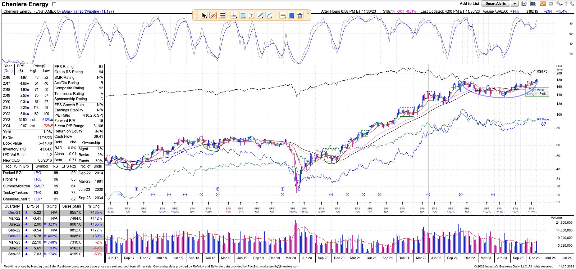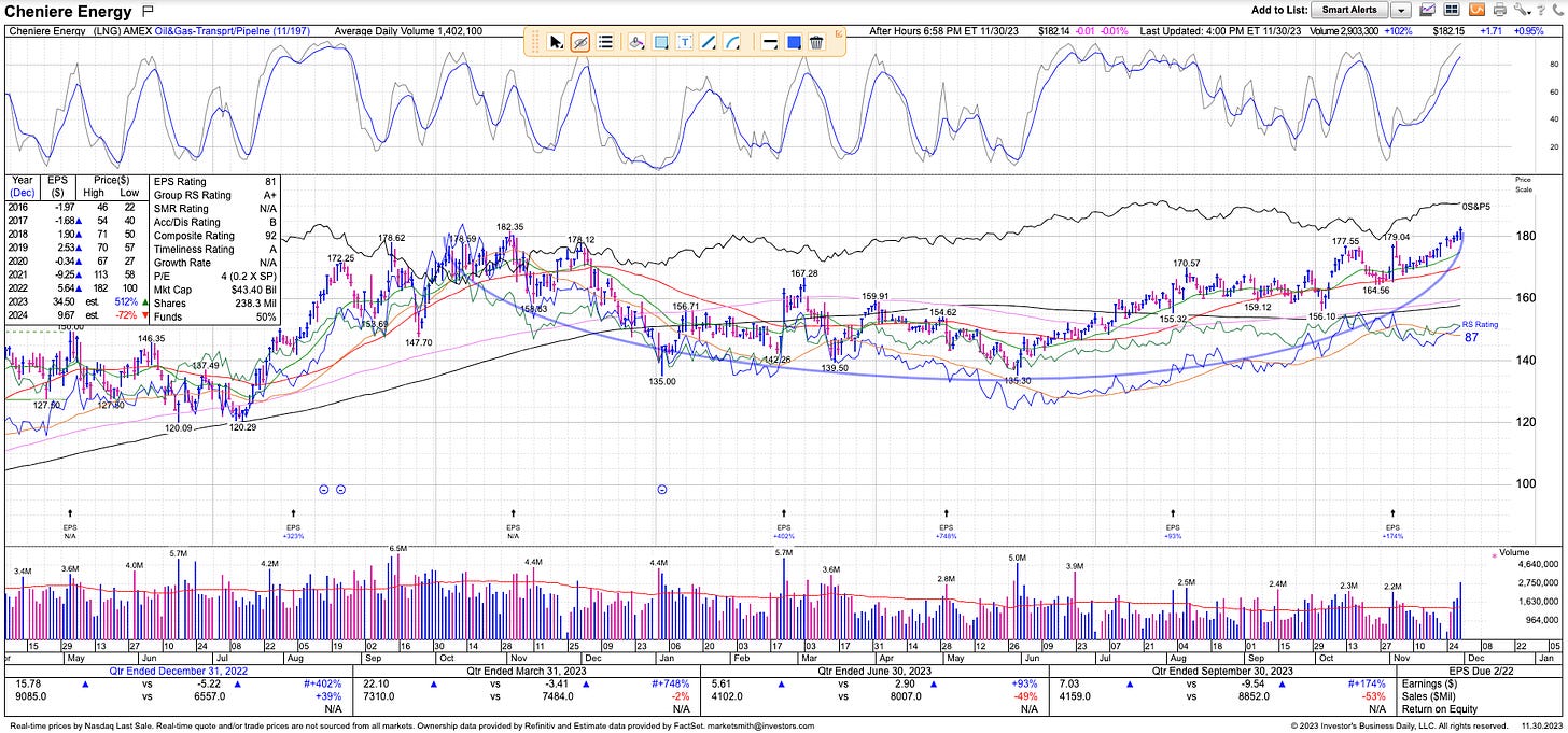 Among new positions, we opened LNG 0.00%↑ which is a bet on natural gas. It broke out from a long cup base on the daily and weekly charts today. It is at all-time highs although the PE is just 4 (EPS has grown much faster than price):