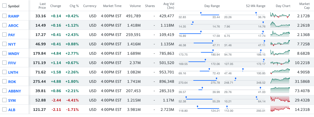 Long: RAMP 0.00%↑ AROC 0.00%↑ PAY 0.00%↑ NYT 0.00%↑ MNDY 0.00%↑ FFIV 0.00%↑ LNTH 0.00%↑ ROK 0.00%↑ $ABBNY SYM 0.00%↑