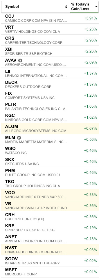 We posted a decent return today, lagging the SPY 0.00%↑ but outperforming the index over a weekly/last 5-day basis with lower volatility. Winners include CCJ 0.00%↑ VRT 0.00%↑ CRS 0.00%↑ all gaining ~3% or more.