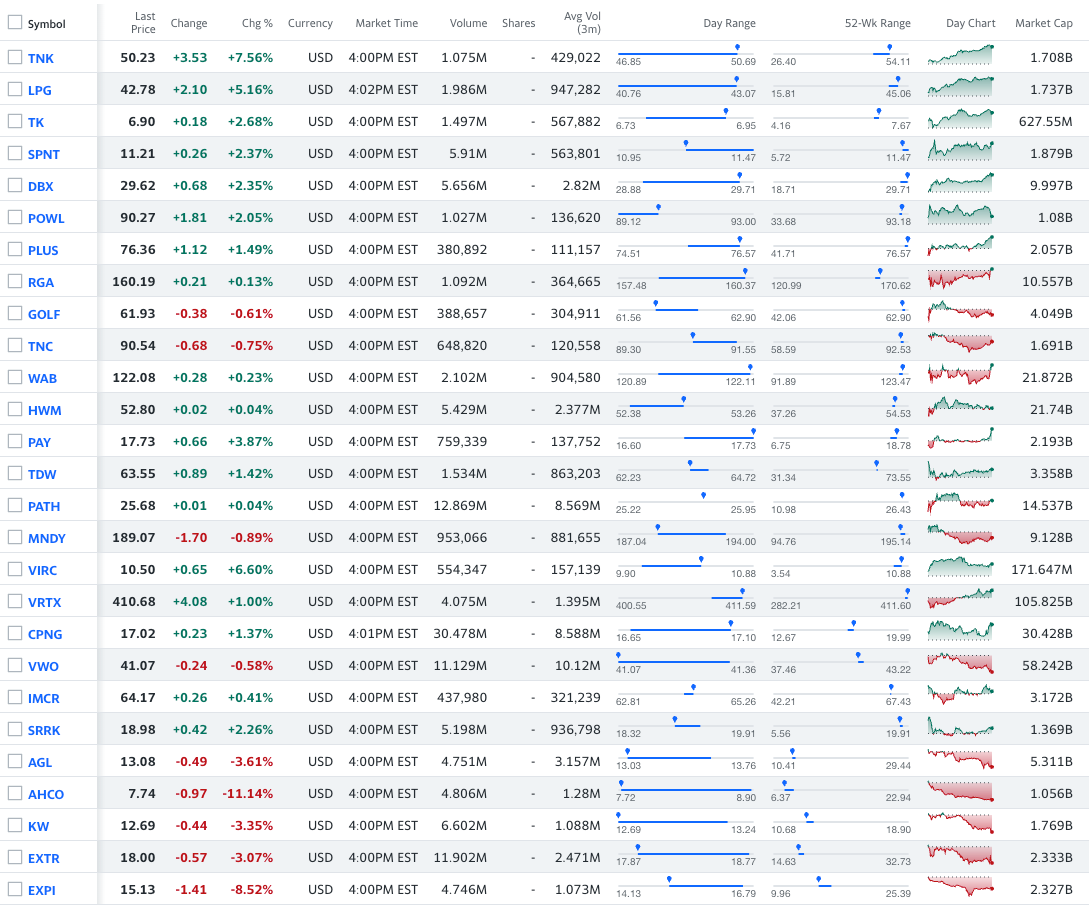 Long: TNK 0.00%↑ LPG 0.00%↑ TK 0.00%↑ SPNT 0.00%↑ DBX 0.00%↑ POWL 0.00%↑ PLUS 0.00%↑ RGA 0.00%↑ GOLF 0.00%↑ TNC 0.00%↑ WAB 0.00%↑ HWM 0.00%↑ PAY 0.00%↑ TDW 0.00%↑ PATH 0.00%↑ MNDY 0.00%↑ VIRC 0.00%↑ VRTX 0.00%↑ CPNG 0.00%↑ VWO 0.00%↑ IMCR 0.00%↑ SRRK 0.00%↑