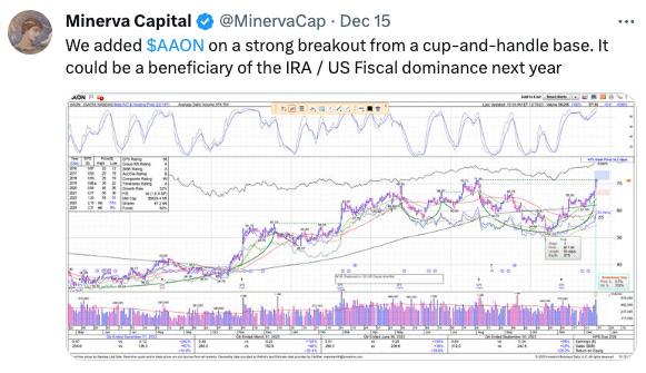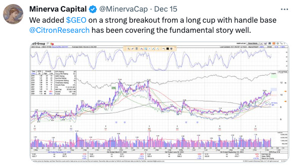 We have a huge buffer of gains from the November bottom when we started to scale in, so we don’t mind some chop and volatility. On Friday, we bought GEO 0.00%↑ and AAON 0.00%↑ as reported on Twitter: