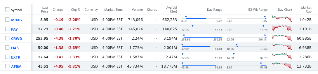 Short: CRWD 0.00%↑ HAS 0.00%↑ EXTR 0.00%↑ AFRM 0.00%↑