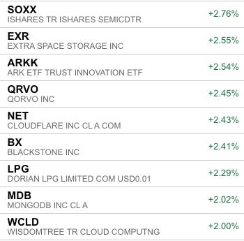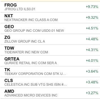 Today was a mirror image of y'day in our portfolio. Holdings that gained >2% include: FROG 0.00%↑ NXT 0.00%↑ GEO 0.00%↑ ZG 0.00%↑ TDW 0.00%↑ QRTEA 0.00%↑ TK 0.00%↑ CLS 0.00%↑ AMD 0.00%↑ SOXX 0.00%↑ EXR 0.00%↑ ARKK 0.00%↑ QRVO 0.00%↑ NET 0.00%↑ BX 0.00%↑ LPG 0.00%↑ MDB 0.00%↑ WCLD 0.00%↑