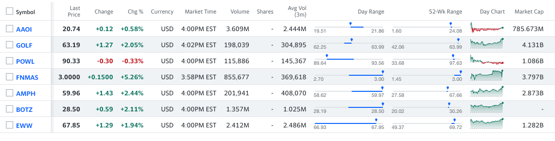 AAOI 0.00%↑ GOLF 0.00%↑ POWL 0.00%↑ $FNMAS AMPH 0.00%↑ BOTZ 0.00%↑ EWW 0.00%↑
