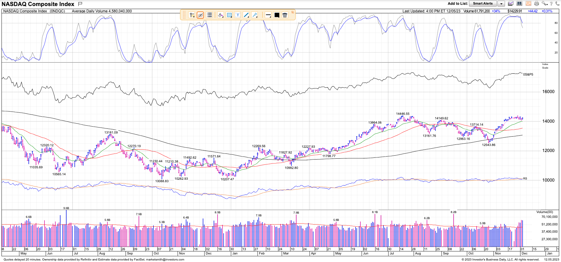 We let the market’s price and volume action guide us, and right now, the guidance from these two major indices is one of caution. That paired with the seasonality charts shared above means it’s better to hold rather than buy here. If you have a lot of gains from the November rally, it’s also not a bad idea to lock some of those in at this point. At the same time, this is not a time to panic and sell everything, as we’re still in a confirmed uptrend.