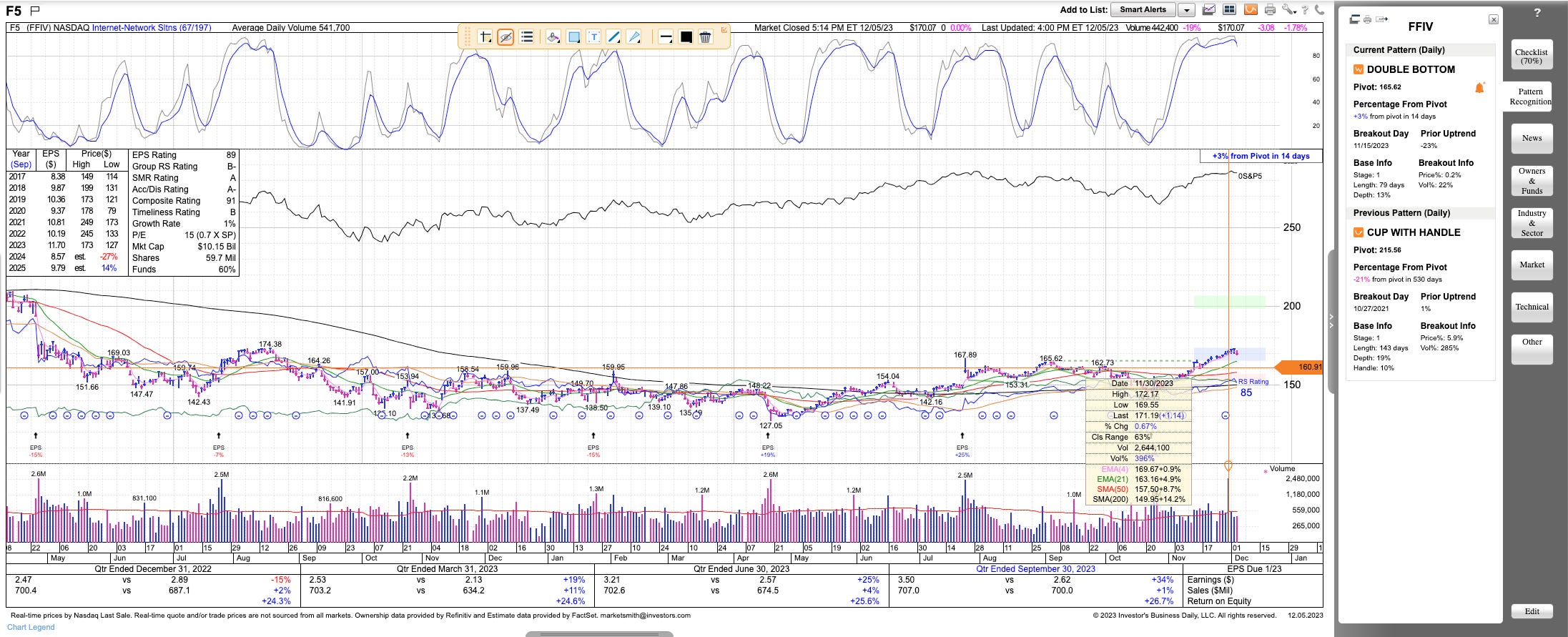 F5 FFIV 0.00%↑ is in a buy range from a double-bottom base and had 4x the average volume on Nov 30: