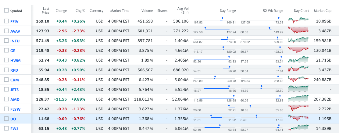 Long: FFIV 0.00%↑ AVAV 0.00%↑ INTU 0.00%↑ GE 0.00%↑ HWM 0.00%↑ RPD 0.00%↑ CRM 0.00%↑ JETS 0.00%↑ AMD 0.00%↑