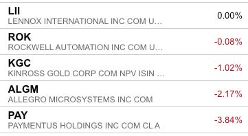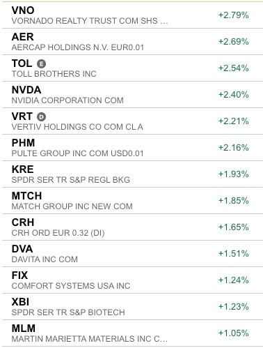 We had a good day today, with almost all positions up on the day. Luckily not too many of our stops got hit. For gainers, we are reporting just those with moves > +1%: