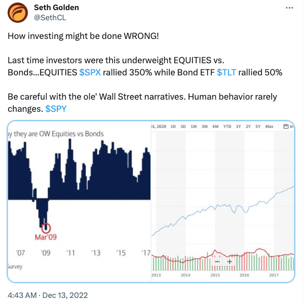 In terms of positioning, there are mixed messages, with some saying that investors have been piling in and are too bullish, and others like Seth Golden saying that sentiment is at record-low levels:
