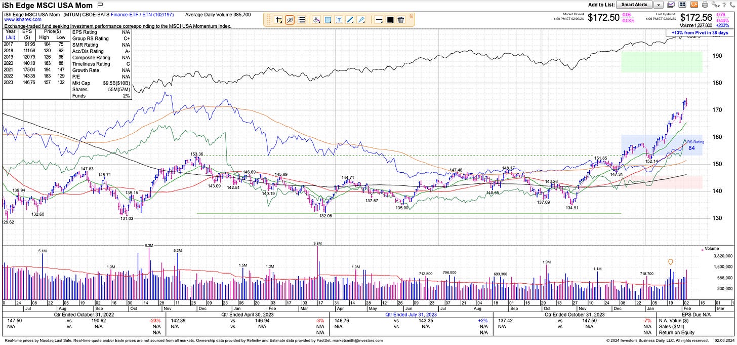 Momentum has been one of the key factors driving relative performance since the October bottom, as seen in this chart of the MTUM 0.00%↑ ETF: