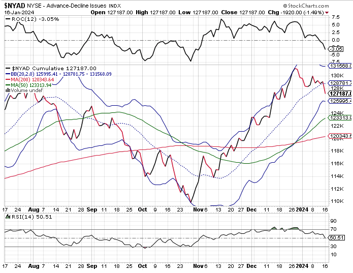 The NYSE Advance/Decline line topped towards the end of December and has been in a steady decline since, which typically coincides with downturns: