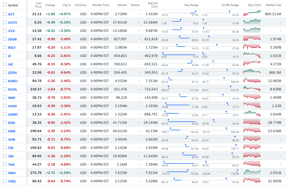 Stocks: SDGR 0.00%↑ RELY 0.00%↑ IE 0.00%↑ IAC 0.00%↑ QTRX 0.00%↑ ROKU 0.00%↑ DUOL 0.00%↑ MMI 0.00%↑ AVDX 0.00%↑ UDMY 0.00%↑