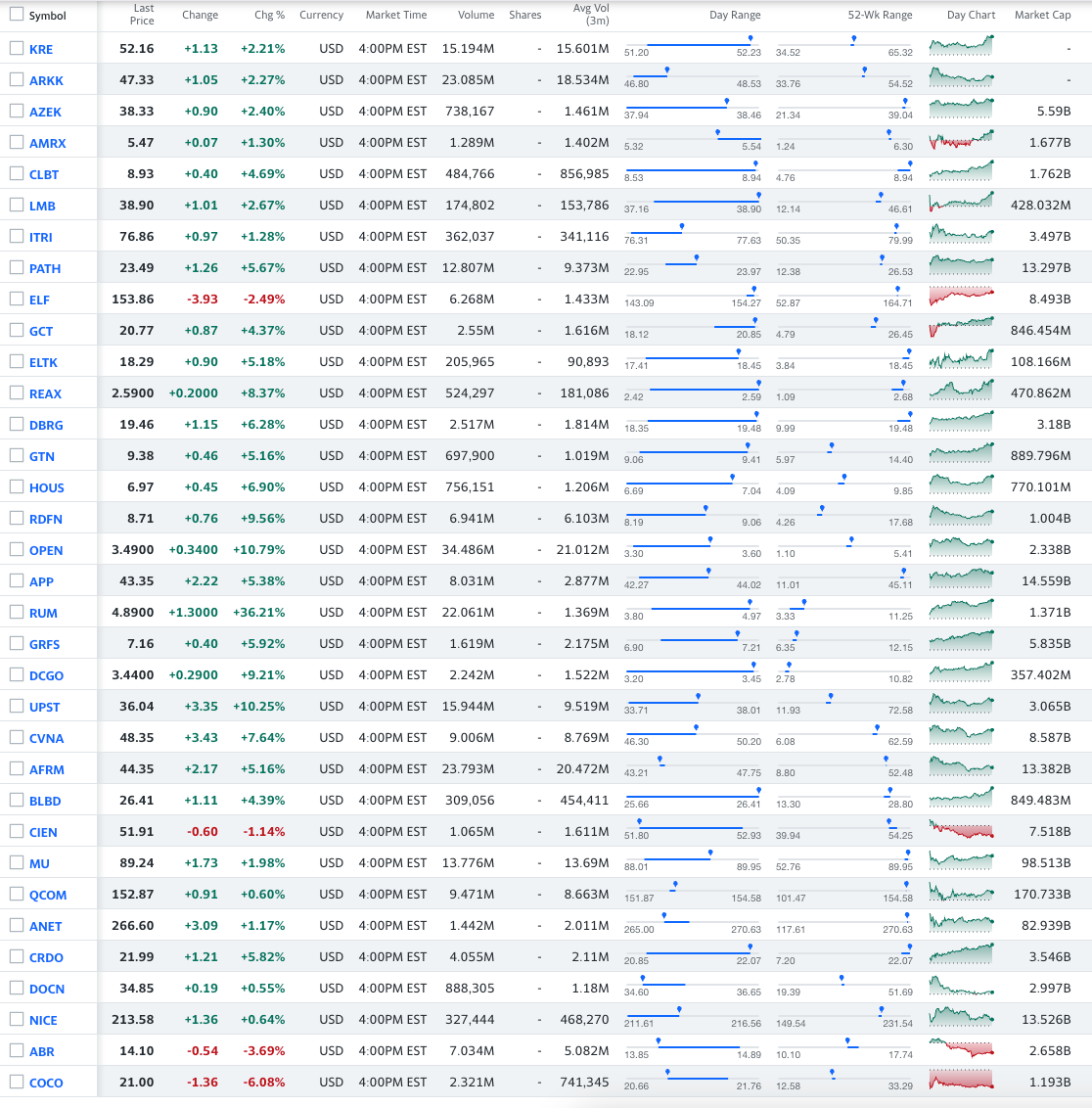 Long: KRE 0.00%↑ ARKK 0.00%↑ AZEK 0.00%↑ AMRX 0.00%↑ CLBT 0.00%↑ LMB 0.00%↑ ITRI 0.00%↑ PATH 0.00%↑ ELF 0.00%↑ GCT 0.00%↑ ELTK 0.00%↑ REAX 0.00%↑ DBRG 0.00%↑ GTN 0.00%↑ HOUS 0.00%↑ PATH 0.00%↑ RDFN 0.00%↑ OPEN 0.00%↑ APP 0.00%↑ RUM 0.00%↑ GRFS 0.00%↑ DCGO 0.00%↑ UPST 0.00%↑ CVNA 0.00%↑ AFRM 0.00%↑ BLBD 0.00%↑ CIEN 0.00%↑ MU 0.00%↑ QCOM 0.00%↑ ANET 0.00%↑ CRDO 0.00%↑ DOCN 0.00%↑ NICE 0.00%↑