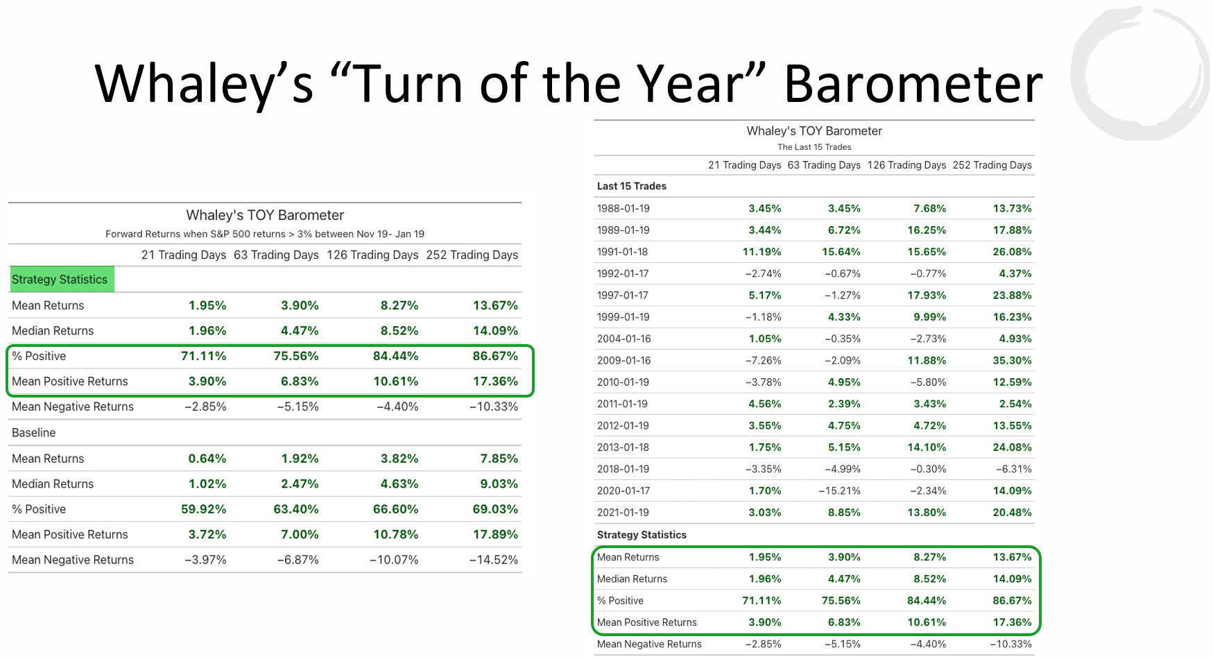 Wayne Whaley is a legendary quant who once remarked that if he were limited to using only one indicator for betting on trend direction for the year, it’d be his TOY (Turn Of Year) Barometer. There’s a good reason for this. A bullish TOY signal has a very high win rate. You can find more on how the TOY Barometer is constructed here. This barometer fired a bullish signal this past week.