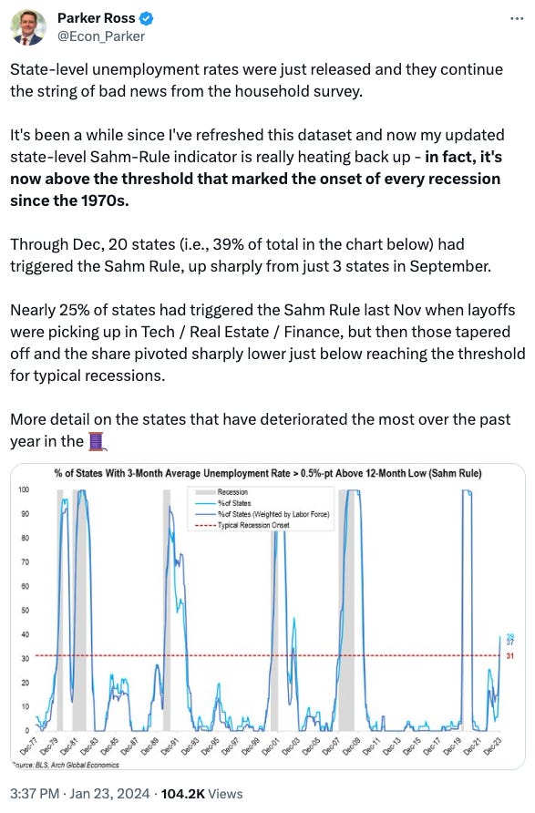 At the same time, some ominous signs are brewing, as Parker Ross shared in this analysis of state unemployment numbers ticking up to a level that has predicted recessions in the past. Parker is not a permabear so this bears watching:
