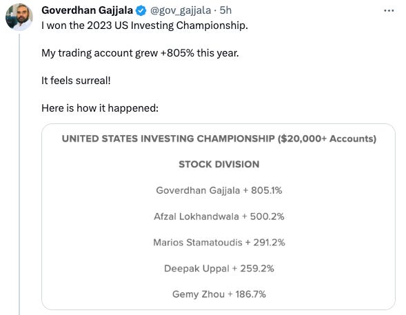 The USIC results were announced and Goverdhan Gajjala won in the 20K+ category with an 805%+ return! He shares some resources in this thread that are worth following: