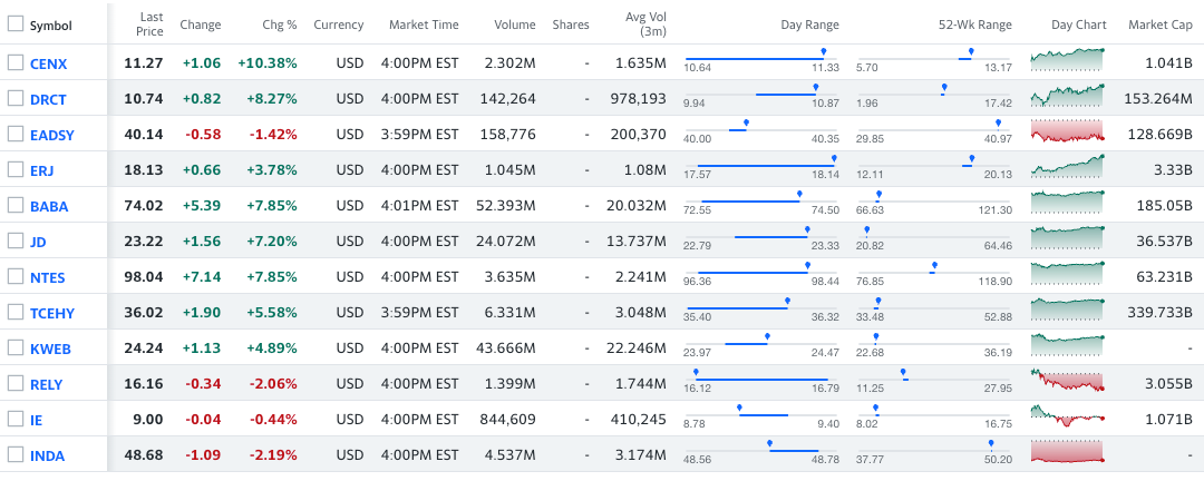 Long: CENX 0.00%↑ DRCT 0.00%↑ $EADSY ERJ 0.00%↑ BABA 0.00%↑ JD 0.00%↑ NTES 0.00%↑ $TCEHY KWEB 0.00%↑ FXI 0.00%↑