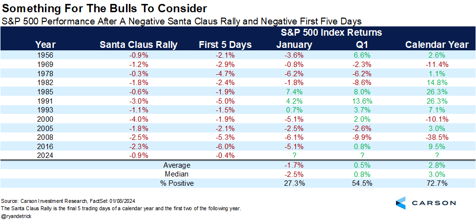 Here is another look at how January, Q1, and the whole year fare after a negative Santa Claus Rally and negative first 5 trading days: