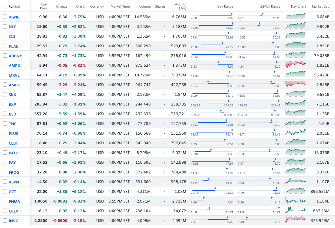 AGNC 0.00%↑ NLY 0.00%↑ CLS 0.00%↑ PLAB 0.00%↑ $ABBNY AMRX 0.00%↑ MRVL 0.00%↑ AMPH 0.00%↑ SKX 0.00%↑ EXP 0.00%↑ BLD 0.00%↑ TNC 0.00%↑ PLUS 0.00%↑ CLBT 0.00%↑ PATH 0.00%↑ PAY 0.00%↑ FROG 0.00%↑ ASPN 0.00%↑ GCT 0.00%↑ $FNMA CPLP 0.00%↑ INVZ 0.00%↑