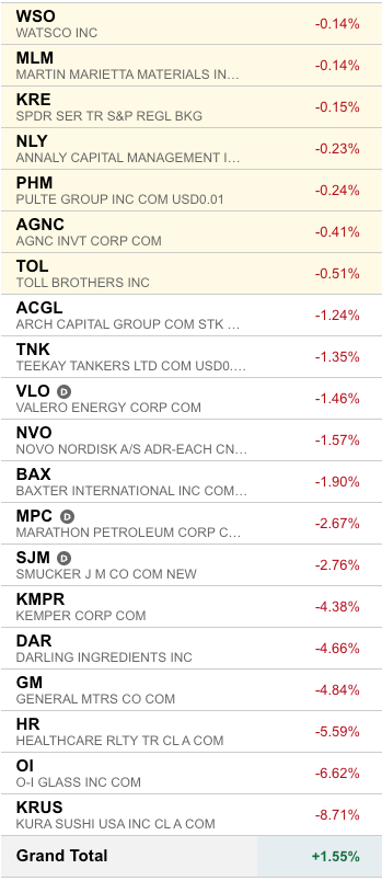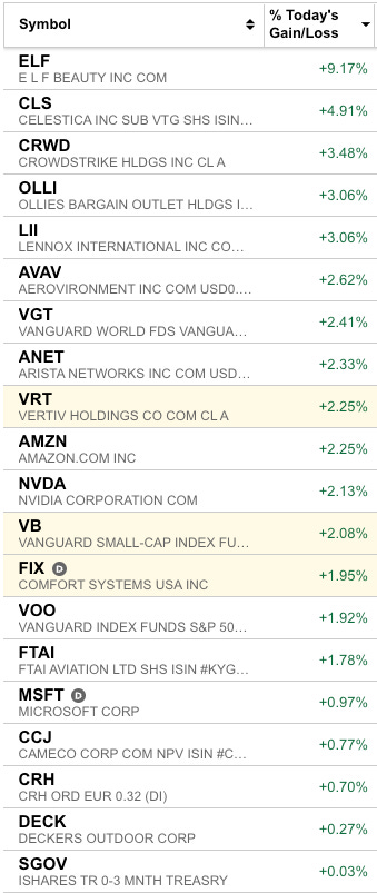 Several of our stocks posted strong gains today, along with our outsized beta weighting where we added VB 0.00%↑ (small caps) to VOO 0.00%↑ (large caps) and VGT 0.00%↑ (tech).