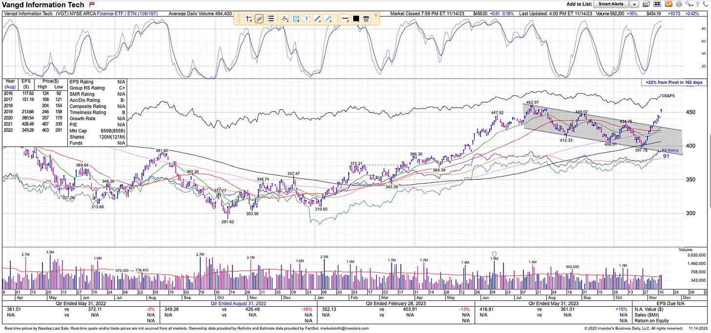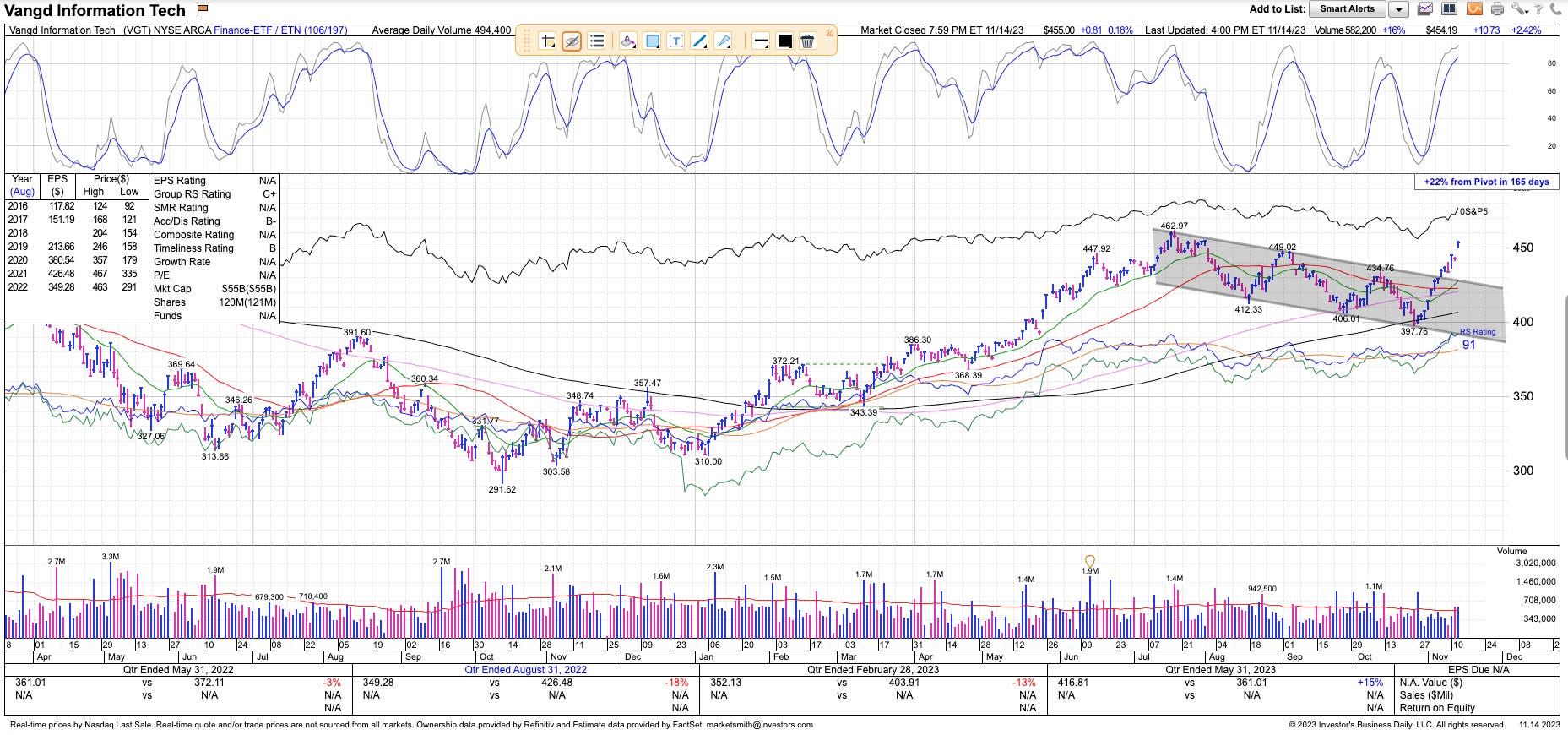 The Nasdaq / Tech Sector (represented here by VGT 0.00%↑ ) had broken out of its downward channel as we covered recently. Now it is well out of the channel on strong volume and there seems to be no stopping it either.
