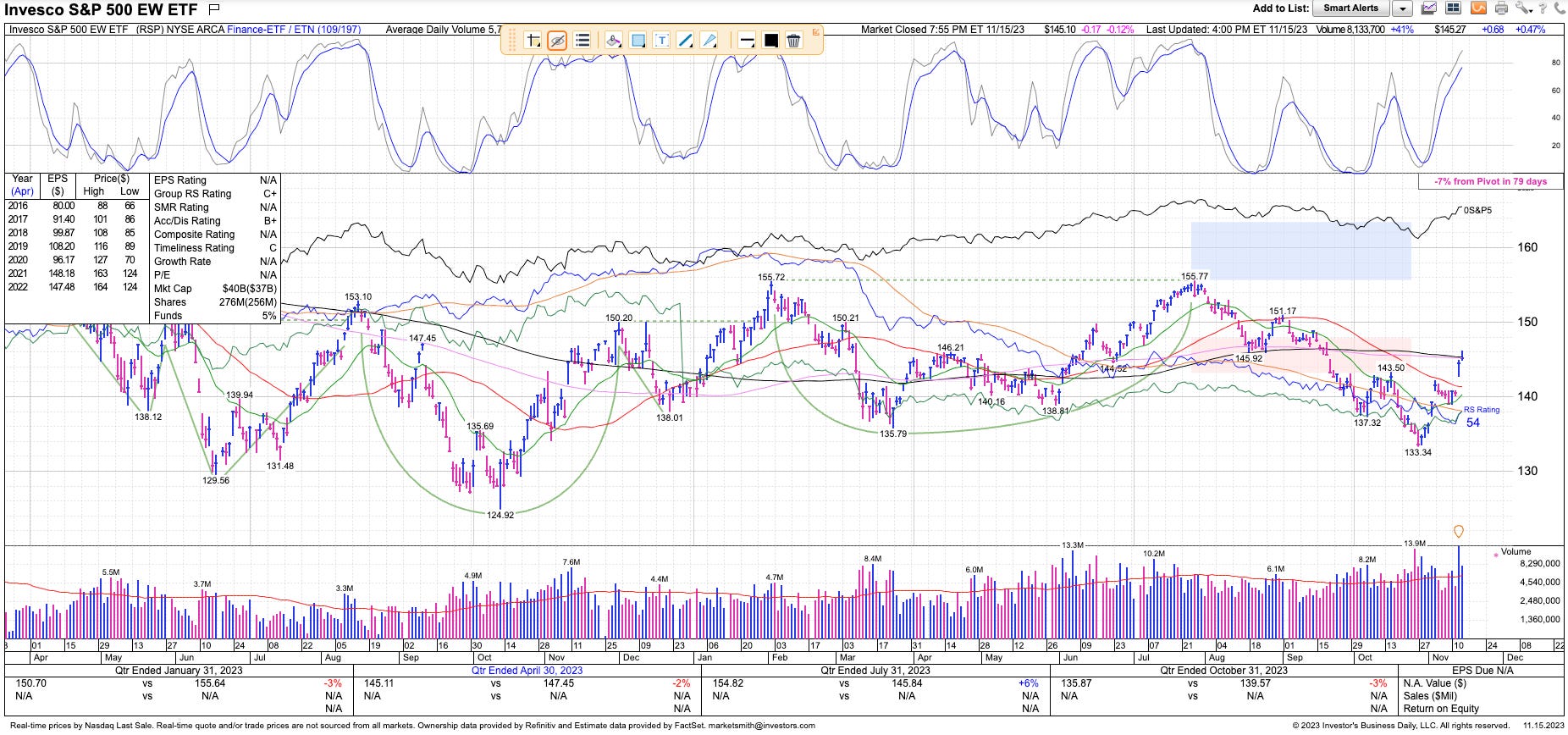 Another way to look at it is with RSP 0.00%↑ - the equal weight S&P 500 ETF, which is also showing stronger relative strength recently as compared to its market cap-weighted counterpart. This shows a further broadening of the rally which is required if it is to sustain.