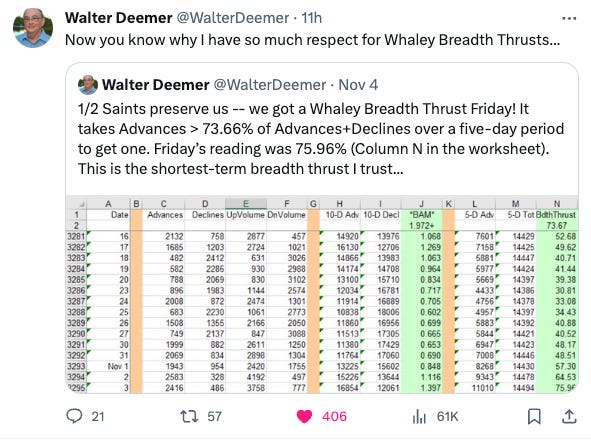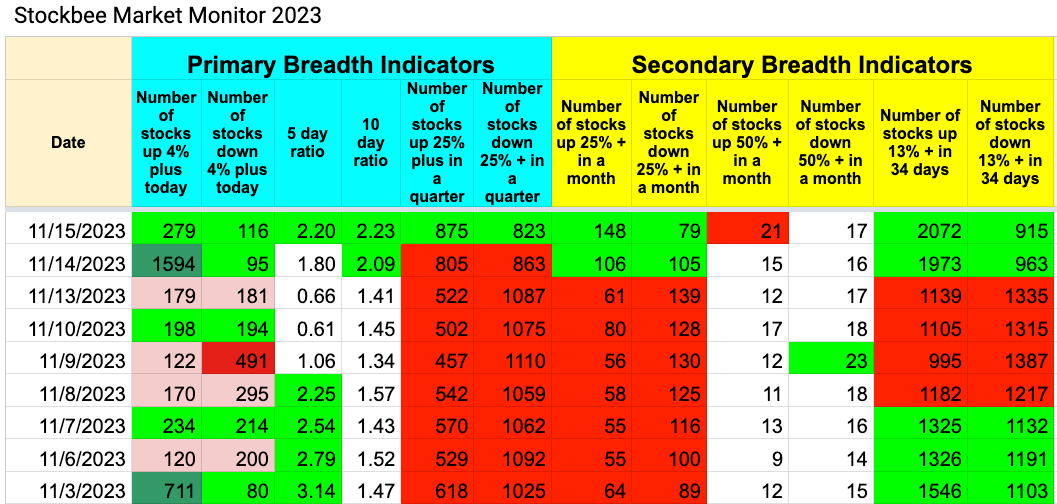 And that brings us to the Stockbee Market Monitor breadth indicators, which all show strength across the board. The 10-day ratio turning green after a bearish phase is considered bullish. The only red flag in the top row is the “number of stocks up 50%+ in a month” showing overbought/extreme bullishness. It can cool off with some consolidation here.