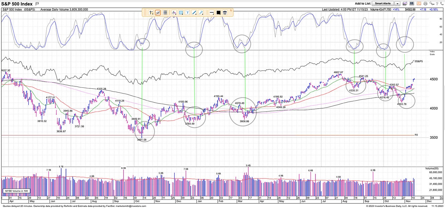 The S&P / SPY 0.00%↑ continued its advance and is in overbought territory now. It cleared and closed above the psychologically important level of 4500. Indices can stay overbought for long, so this is not necessarily a sell signal yet.