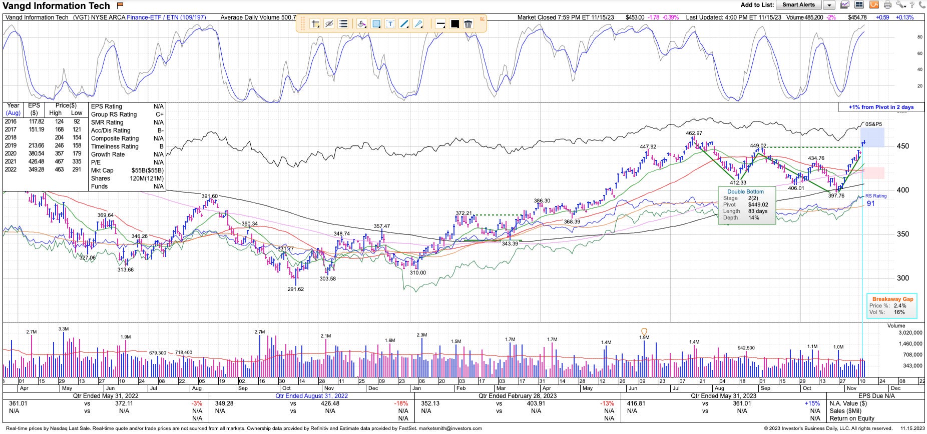The Nasdaq as represented by our preferred ETF VGT 0.00%↑ is now in the buy zone of a double-bottom base as per this MarketSmith chart. However, this might not be the best time to chase it considering the mega-caps are already quite stretched.