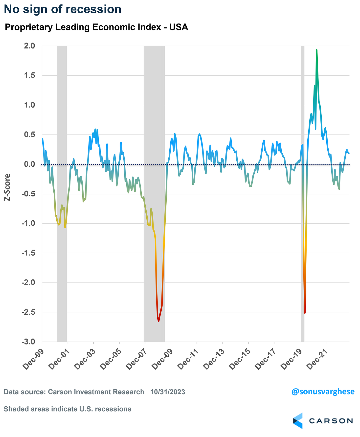 Now that we’re done with the technical indicators, here is a more fundamental/macro indicator — the Carson Group has been prescient this year in their market and economy calls. Their proprietary LEI (Leading Economic Indicator) is not showing any near-term signs of a recession yet:
