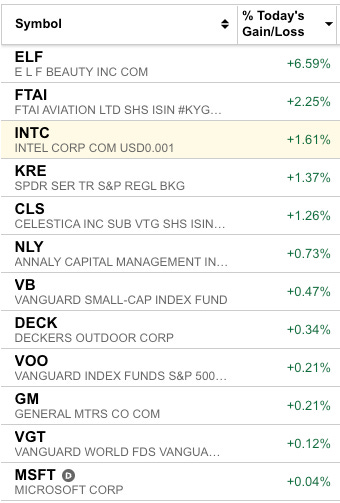 Today started strong but was a mixed day on the close for us, with the portfolio still being tilted towards the heavyweight / stronger names. Nonetheless, we saw great gains in ELF 0.00%↑ FTAI 0.00%↑ and others. We booked profits on CRWD 0.00%↑ and closed out NVO 0.00%↑ , which showed weakness from this rotation out of defensives. The largest weights in our portfolio are on the beta side: VOO 0.00%↑ VGT 0.00%↑ and VB 0.00%↑ and all saw decent upticks today.
