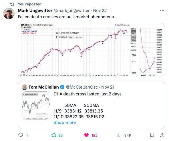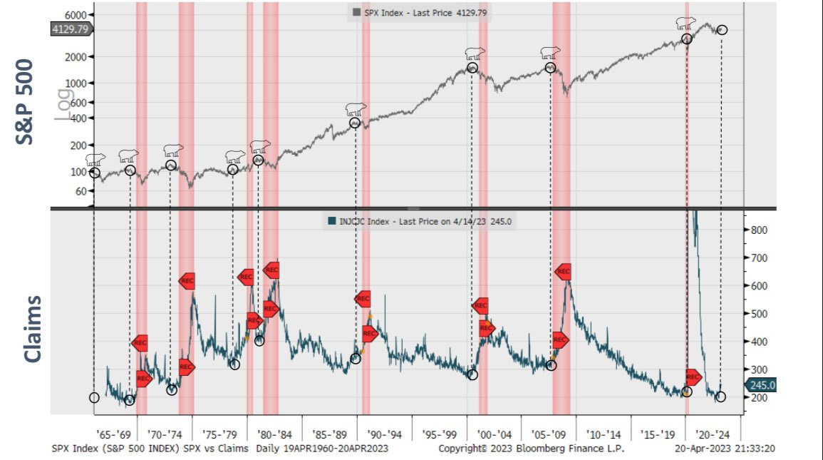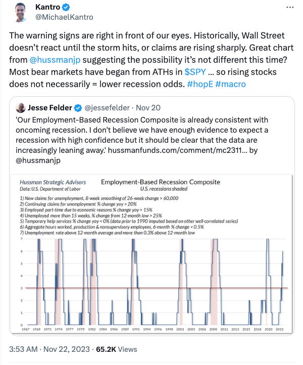 This is confirmed by one of the renowned bears Michael Kantro, who has been calling for a recession for some time now. But I’d flip his reasoning around to say that stocks won’t decline materially too far ahead of a recession - it’s more likely that it happens almost concurrently. And a recession is not on the cards until at least Q2 2024 based on how the economy is performing.