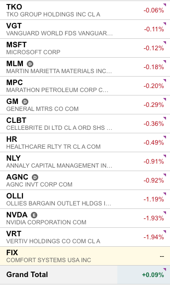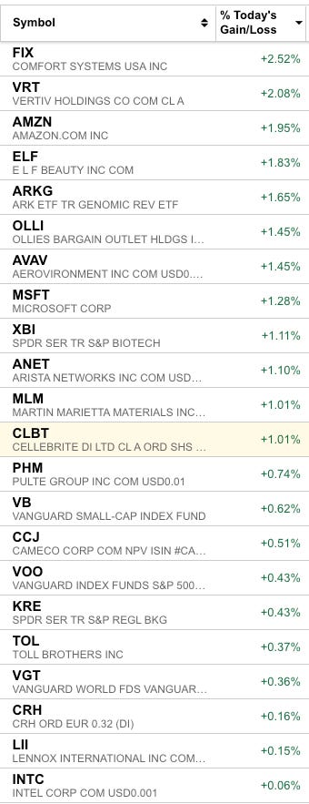 We continue to remain 80% net long. On Wednesday, we gained 0.5% in our trading portfolio with stocks such as FIX 0.00%↑ VRT 0.00%↑ AMZN 0.00%↑ gaining ~2%.