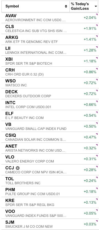 On Friday, stocks such as AVAV 0.00%↑ CLS 0.00%↑ and ARKG 0.00%↑ were the winners helping us eke out a gain slightly better than the SPY 0.00%↑. NVDA 0.00%↑ detracted from performance on both days.