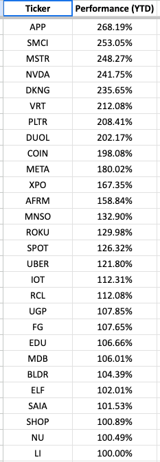 The rally this year has been broader than just the Mag-7 stocks (as inaccurately reported by the media). Jonah Lupton posted this showing how many stocks with market caps > $5B have gained more than 100% YTD: