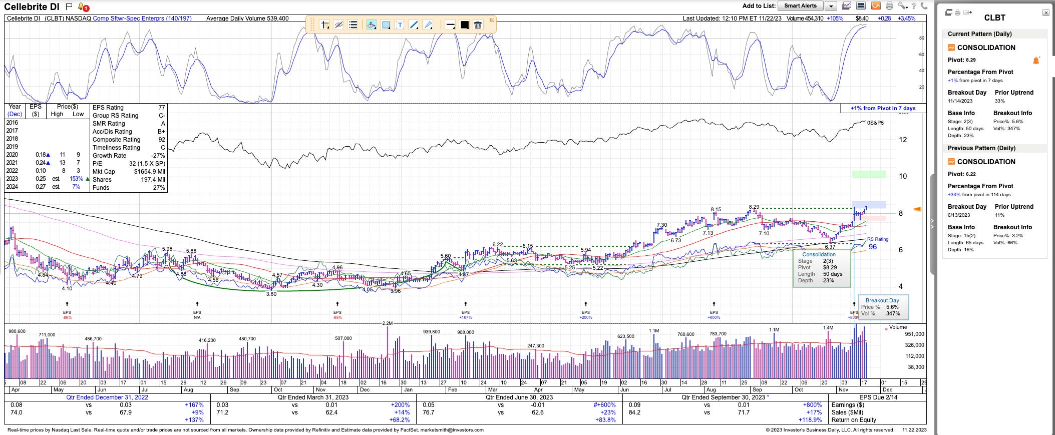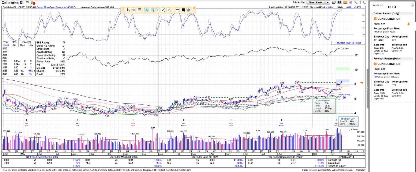We bought CLBT 0.00%↑ in the Minerva portfolio on Wednesday. It has strong growth and is coming out of a stage 2 base on heavy volume:
