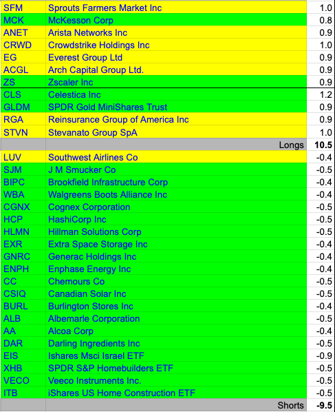 The shorts are typically half the size of the long positions. GLDM 0.00%↑ (Gold ETF) while counted in the long book is really a hedge, so the active trading portfolio is currently net zero on balance. I do have about 6% in longer-term investments which I cannot sell so I will look to further hedge those tomorrow based on the price action.