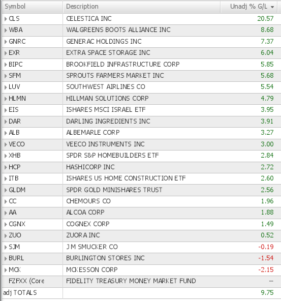 Here is a picture of our trading portfolio (both longs and shorts) with the open gains / losses: