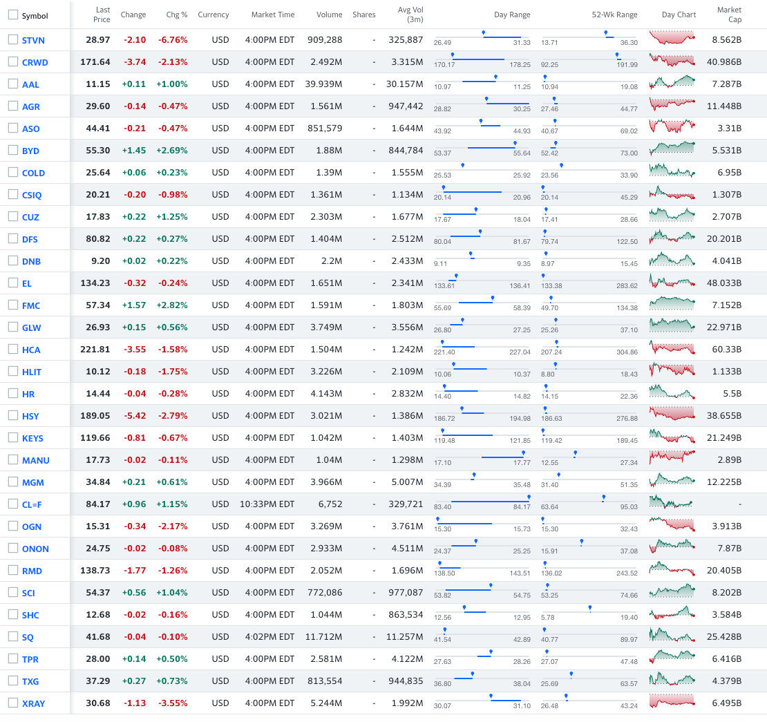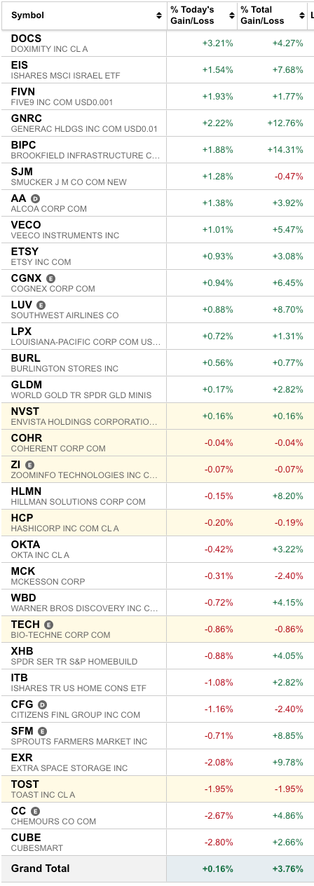 On the short side, we again have a buffet of options, but we will monitor price closely to see if any are worthy of adding: AAL 0.00%↑ AGR 0.00%↑ ASO 0.00%↑ BYD 0.00%↑ COLD 0.00%↑ CSIQ 0.00%↑ CUZ 0.00%↑ DFS 0.00%↑ DNB 0.00%↑ EL 0.00%↑ FMC 0.00%↑ GLW 0.00%↑ HCA 0.00%↑ HLIT 0.00%↑ HR 0.00%↑ HSY 0.00%↑ KEYS 0.00%↑ MANU 0.00%↑ MGM 0.00%↑ O 0.00%↑ OGN 0.00%↑ ONON 0.00%↑ RMD 0.00%↑ SCI 0.00%↑ SHC 0.00%↑ SQ 0.00%↑ TPR 0.00%↑ TXG 0.00%↑ XRAY 0.00%↑ XYL 0.00%↑ ZBH 0.00%↑