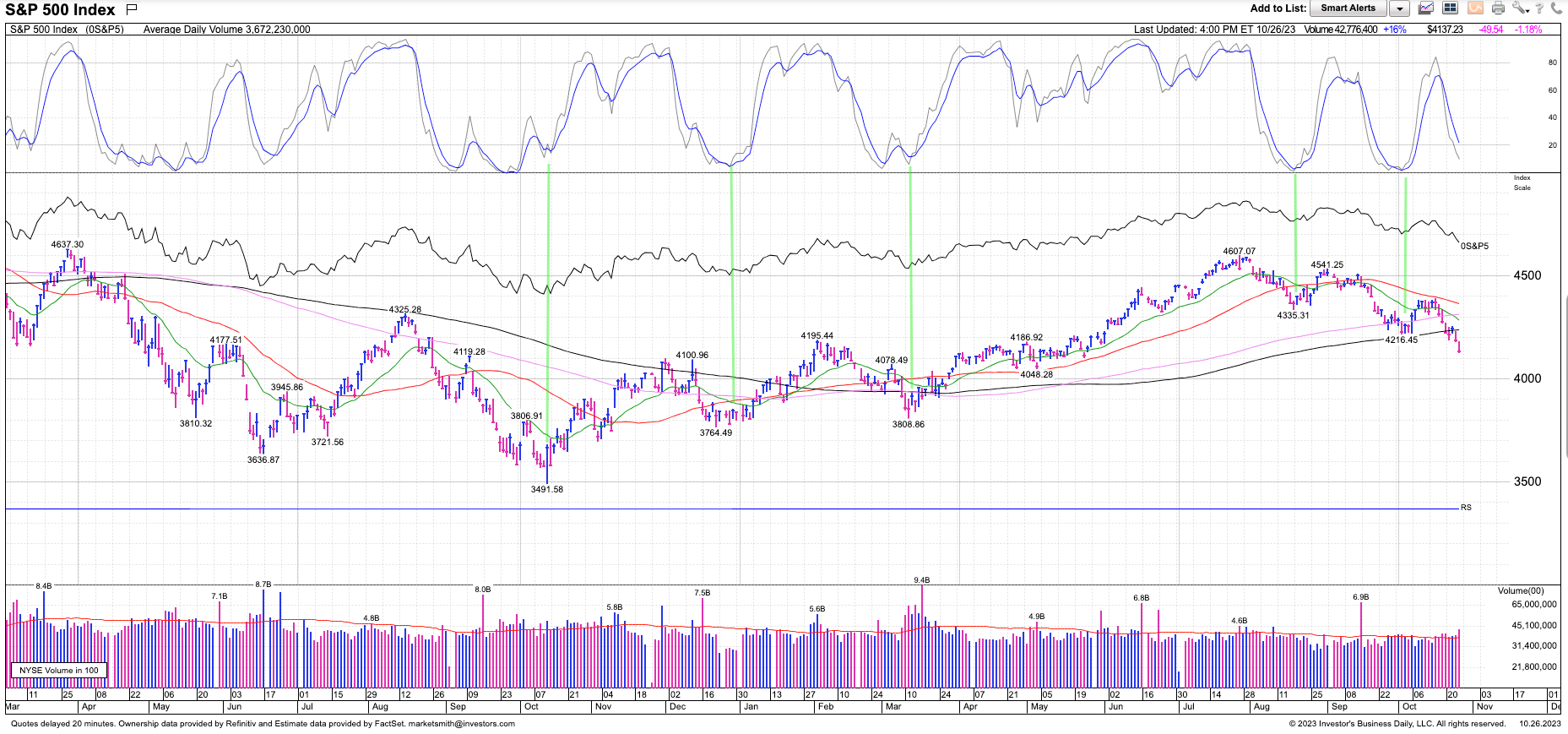 The S&P has breached all major near-term support levels on heavy volume now. However, as we posted on Twitter, it hasn’t reached oversold levels yet. Most recent tradeable bottoms have been accompanied by an upward reversal of stochastics from oversold territory along with a price confirmation (see green lines below). We're not there yet: