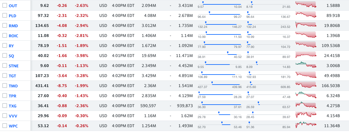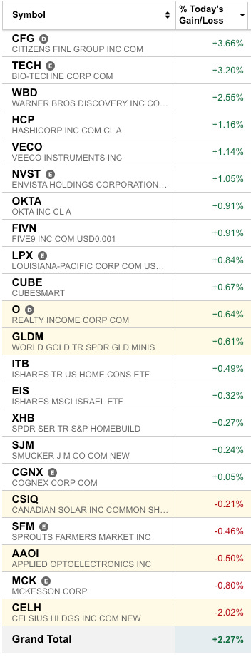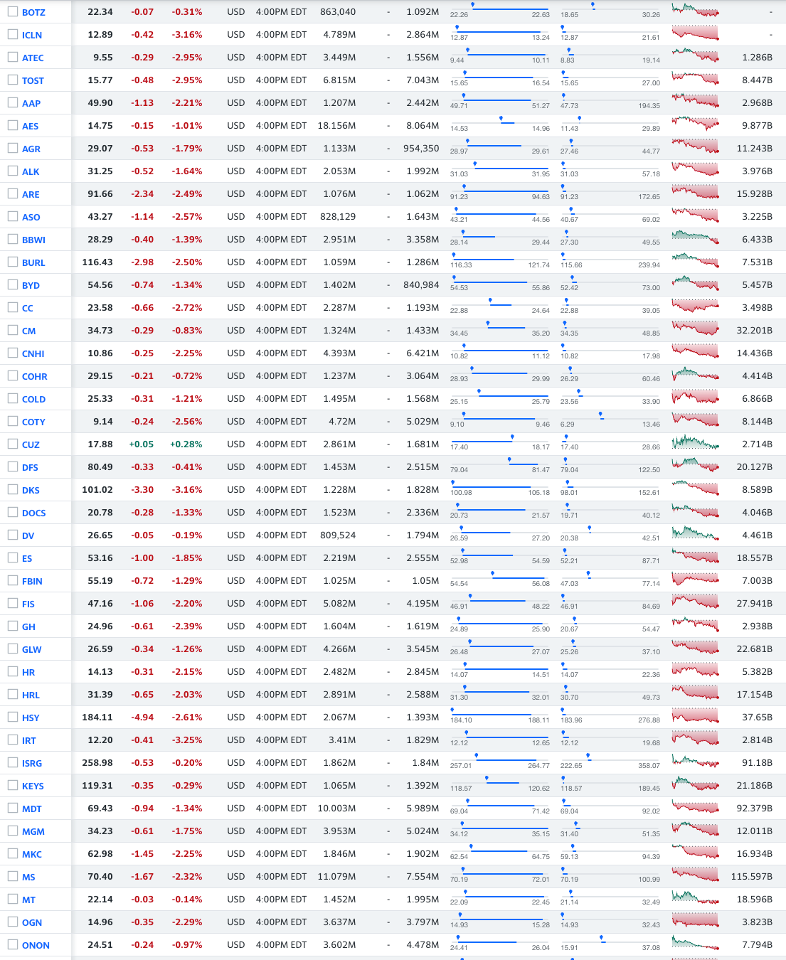 BOTZ 0.00%↑ ICLN 0.00%↑ ATEC 0.00%↑ TOST 0.00%↑ AAP 0.00%↑ AES 0.00%↑ AGR 0.00%↑ ALK 0.00%↑ ARE 0.00%↑ ASO 0.00%↑ BBWI 0.00%↑ BURL 0.00%↑ BYD 0.00%↑ CC 0.00%↑ CM 0.00%↑ CNHI 0.00%↑ COHR 0.00%↑ COLD 0.00%↑ COTY 0.00%↑ CUZ 0.00%↑ DFS 0.00%↑ DKS 0.00%↑ DOCS 0.00%↑ DV 0.00%↑ ES 0.00%↑ FBIN 0.00%↑ FIS 0.00%↑ GH 0.00%↑ GLW 0.00%↑ HR 0.00%↑ HRL 0.00%↑ HSY 0.00%↑ IRT 0.00%↑ ISRG 0.00%↑ KEYS 0.00%↑ MDT 0.00%↑ MGM 0.00%↑ MKC 0.00%↑ MS 0.00%↑ MT 0.00%↑ OGN 0.00%↑ ONON 0.00%↑ OUT 0.00%↑ PLD 0.00%↑ RMD 0.00%↑ ROIC 0.00%↑ RY 0.00%↑ SQ 0.00%↑ STNE 0.00%↑ TGT 0.00%↑ TMO 0.00%↑ TPR 0.00%↑ TXG 0.00%↑ VVV 0.00%↑ WPC 0.00%↑